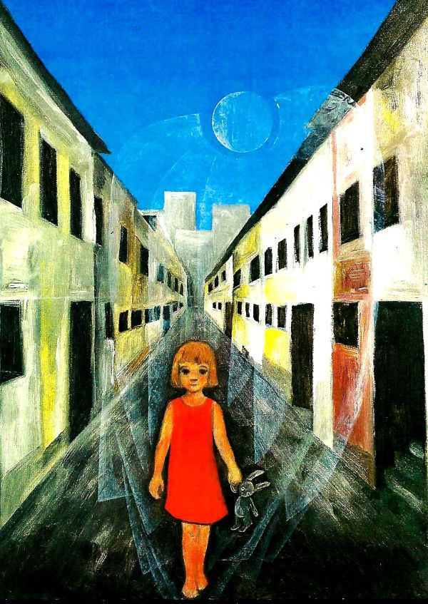 Sie beschützen Dich, wie die leicht angedeutete Schattenseite um das Kind zeigt, welches durch die hohle Gasse geht, alleine. Das Kind weiß: Mein Schutzengel kümmert sich um mich.