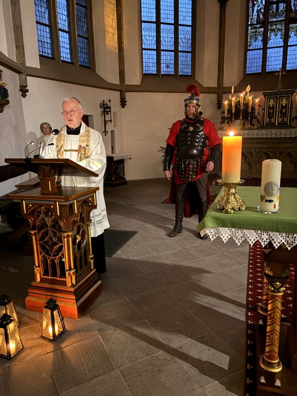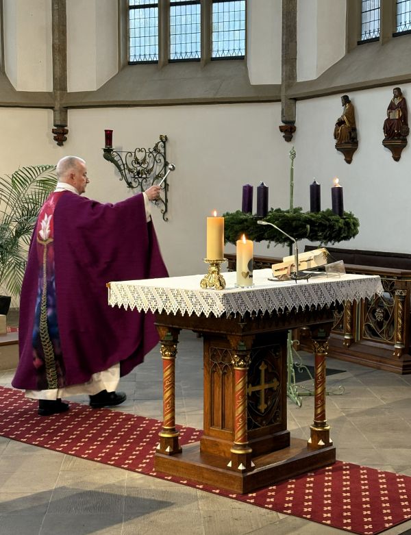 Pastor Friedrichs segnet die 1. Kerze des Adventkranzes, die Kerze der Hoffnung.